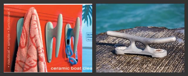 I gotta say though, you can do this for a lot cheaper, and with much more authenticity. Its pretty easy to find old boat cleats on the cheap; either from a junked boat, marine swap meet, even craigslist. Plus they give you that added dose of personality/history, knowing that thousands of boats have tied-up to that very cleat.